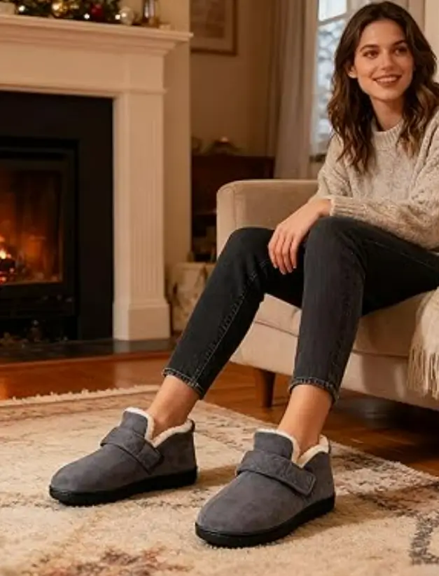 I am very happy with these house shoes and feel like I finally found the right pair after returning two other brands due to fit problems. I normally wear a women’s size 11, but after carefully reviewing the size chart, I ordered a size 12 and the fit turned out to be perfect. These shoes provide the stability and comfort I need, especially after having a stroke in April, which makes proper support very important to me. The soft, fur-style lining and cushioned footbed make them comfortable to wear for long periods. There is plenty of toe room, which adds to the overall comfort and ease of movement. I wore them all day, both indoors and outdoors, without any discomfort. The adjustable Velcro side strap helped keep my foot secure, with no sliding, and the sole felt flexible rather than stiff. I felt stable and confident walking outside, even on uneven surfaces. I was also pleasantly surprised that sand did not get inside the shoe, which is a big plus living in Florida. Overall, the price feels fair, and I expect to get a lot of use out of these shoes over time